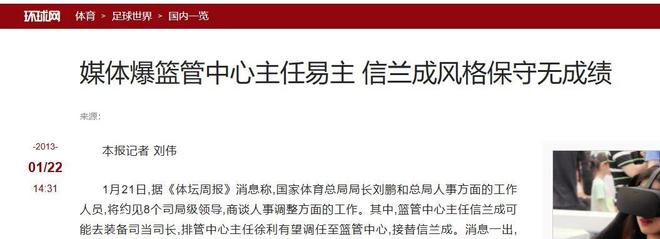 3.《媒体爆篮管中心主任易主 信兰成风格保守无成绩》来源:环球网-2013-01/2214:31